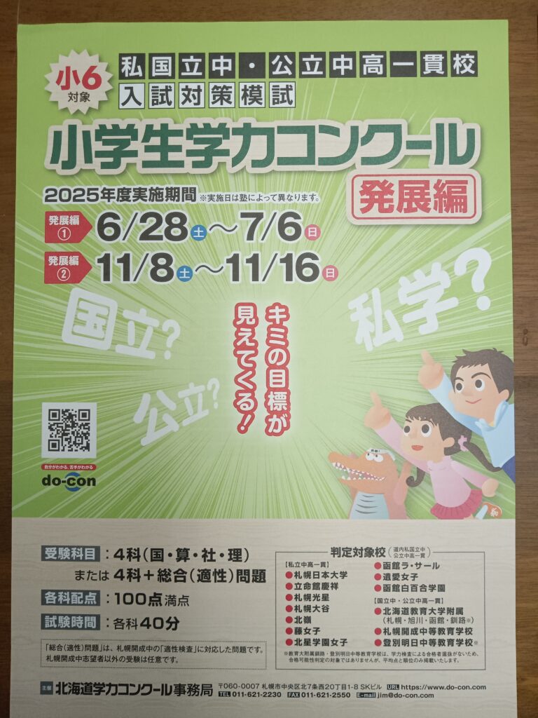 本年度から当学習塾では小学生学力コンクールを実施しております。先日8月に第2回を実施させて頂きました。次回は第3回を2026年1月実施予定です。試験のみの受験も可能ですので岩内町、共和町の学生様、近郊の俱知安町、ニセコ町の学生様にもご利用頂けたらと思います。発展編もご希望に応じ実施させて頂きます。詳細については当塾までお問い合わせください。