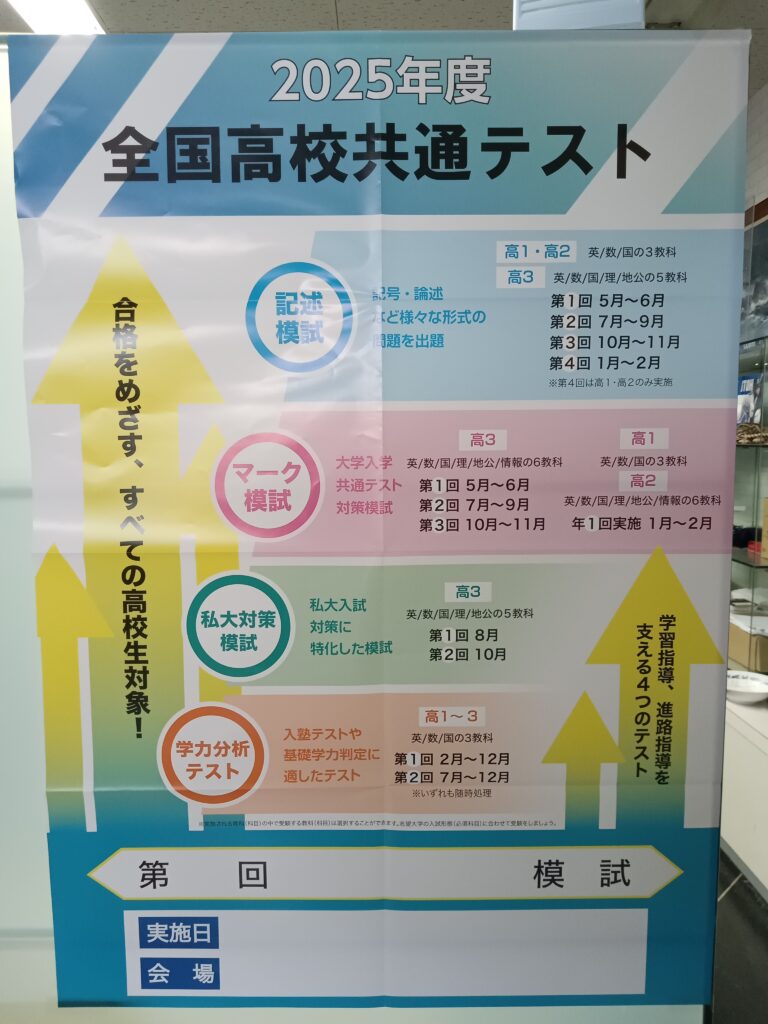 高校生 集合時間と終了時間は受験科目数や学年、模試の種類によって異なります。また、実施日は期間内の日曜日に行っておりますが詳細は当塾までお問い合わせください。